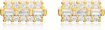 Rectangular studs with triple baguette cubic zirconia stones in center and micro stones surrounding baguettes.