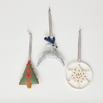 This beautiful set of three completes your holiday decorating with each ornament handcrafted by refugee artisans. These ornaments represent hope and resiliency and are a symbol of solidarity with the refugee community. Give a gift that tells a story this holiday season. This set includes: Proud Pine: Crafted by Afghan refugees living in Pakistan This small tree is adorned with Tarshumar embroidery, a traditional Afghan technique known for its precise geometric patterns. Rooted in heritage but reaching for the sky, the Proud Pine symbolizes quiet strength and the hope of new opportunity. Dashing Deer: Crafted by Afghan refugees living in Malaysia The Bactrian deer, once thought extinct due to decades of war in Afghanistan, was recently rediscovered. Now, the deer symbolizes the resilient and enduring spirit of Afghans. Eternal Snowflake: Crafted by Afghan refugees living in India This detailed crochet snowflake is emblematic of the winter peaks and mountain passages that define the landscape of Afghanistan. For Afghans, the snowflake is a reminder of home. Note: These products are handmade and there will be slight variations in shape, size, and colour.