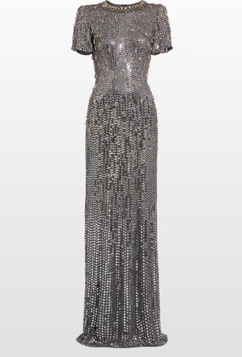 This timeless gown combines understated elegance with a modern, light-catching finish. The fitted silhouette is framed by short sleeves and a soft round neckline, with all-over sequins creating a subtle, shimmering texture. The clean lines and fluid skirt offer a sense of timeless sophistication, making this piece perfect for evening events that call for effortless refinement and quiet glamour.