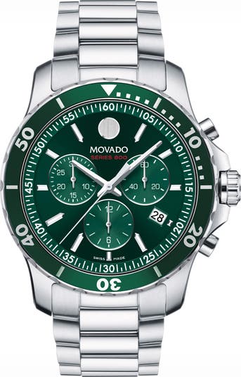 An ombré green dial and rotating bezel distinguish a handsome Swiss-made bracelet chronograph with a polished stainless steel case and bracelet. An iconic museum dot at 12 o'clock brands the timeless silhouette.