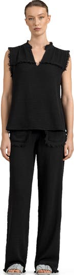 - The lightweight sleeveless top and wide-leg pants made from airy cold-blue muslin fabric are perfect for warm weather.