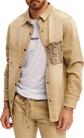 Hints of distressing throughout lend lived-in appeal to a snap-up shirt-jacket crafted from stretch-kissed denim in an oversize silhouette.