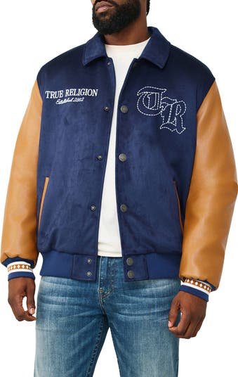 Go from the sidelines to the street in an ultracool bomber jacket accented with striped rib trim and embroidered logos in the front and back.