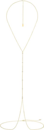 A sleek body chain featuring delicate chainwork and bezel-set stones that drape effortlessly along the neckline and waist for a layered, light-catching look.