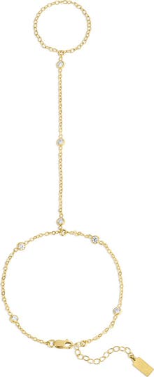 This sleek hand chain pairs a minimalist chain silhouette with dainty stationed stones for an elevated, effortlessly cool statement.