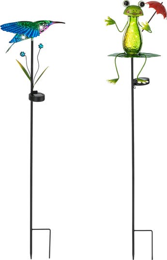 Add a touch of fun and inviting ambiance to your space with this set of decorative solar frog yard stakes and solar hummingbird yard stakes. This colorful and lifelike set of yard stakes is inspired by a cute frog and a fluttering hummingbird. They are sure to brighten up your outdoor garden, patio, yard, lawn, flowerbed, or home vase.
