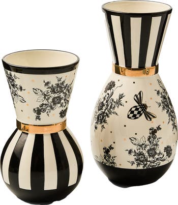 Display your favorite flowers in these two porcelain vases trimmed with a golden rim and decorated with signature stripes and a charming bee motif highlighted by a yellow band and black and white checks.
