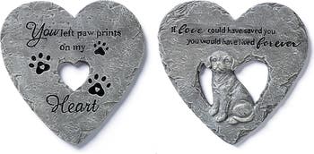 This set includes two 10-inch diameter cement heart-shaped stepping stones, each a touching tribute to beloved dogs. One stone features the heartfelt phrase You left paw prints on my Heart, surrounded by paw print details and a central heart cutout, capturing the lasting imprint of a pet's love. The other stone bears the poignant words If love could have saved you, you would have lived forever, with a sweetly sculpted dog nestled within a heart-shaped opening, honoring the bond between pet and owner.