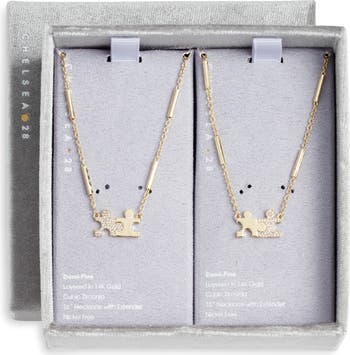 Matching puzzle-piece pendants tipped with sparkling pavé crystals create a keepsake feel in this sweet duo plated in 14-karat gold.