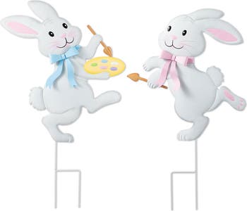 This Set of 2 Easter Metal Yard Stakes features two white bunnies, one with a blue bow holding a paint palette, and the other with a pink bow holding a paintbrush, adding a whimsical, artistic touch to your Easter yard decor.