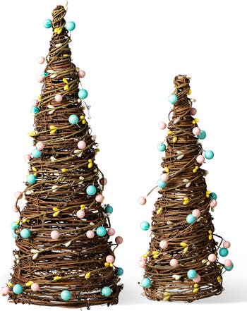 This is a nature-inspired Grapevine Twig Cone Tree with pink and blue berry balls. Display this anywhere in your home that you see fit. Because of its small size, it can serve as a centerpiece on tables and desks, or as a lovely accompaniment on the ledge of the fireplace. Even place it on the ground of your foyer, living room, or family room.