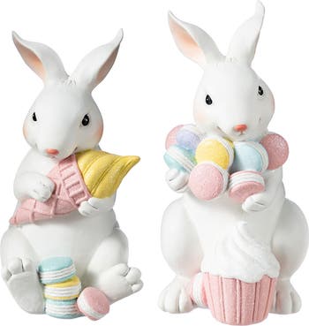 This Set of 2 Easter Resin Table Decor includes 2 charming bunny figurines: one bunny holds colorful macarons and has a pink cupcake at its feet, while the other bunny holds an ice cream cone with macarons scattered around, adding a sweet and festive touch to Easter displays.