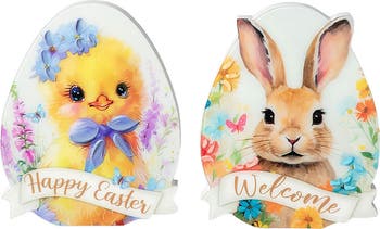 This set of two Easter wooden epoxy egg chick bunny is perfect for adding a pop of color and joy to your home or office, a fluffy bunny with a friendly "Welcome" message and a cheerful chick with a "Happy Easter" greeting. Both designs are covered with flowers and butterflies, adding a touch of springtime beauty to your decor.