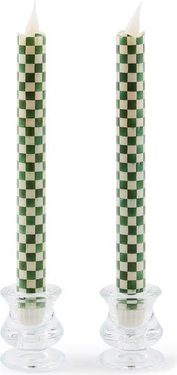 Add to ambience to every setting with this set of two flameless dinner candles decorated with the brand's signature emerald-check pattern. These candles have a wax exterior with a plastic center and cast a flameless glow created with two AAA batteries that can be controlled by the included remote.