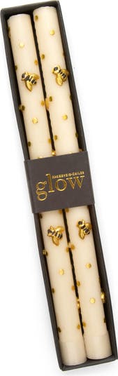 Hand-applied golden bees charm this set of two beeswax-blend taper candles, sure to bring a dose of whimsy to your dinner table decor.