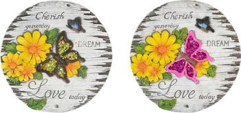 This set of garden stones will add a pop of color and welcome your guests in summer style. Each stone features flowers and a butterfly with the sentiment "Cherish Yesterday, Dream, Love Today". Made from durable resin, this pair will greet your friends from season to season. Set of 2 butterfly and flower garden stones Realistic faux drift wood look Made from durable weather resistant materials Can be used indoor or outdoor Dimensions: 10"H x 10"W x .5"D Material(s): polystone