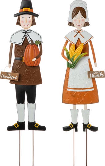 The lovely pilgrim couple yard stake will be a gorgeous decoration in your garden! This set of yard stake is made from metal and featured with the cute pilgrim boy and girl, embellished with classical pumpkin and corn, textured clothes, holding word sign "Give Thanks" and “Be thankful" in their hand. It also offers a delightful way to greet guests on the front porch, or to add a splash of color and character out on back yard.