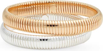 Add an extra touch of metallic shine to your look with these sterling silver and 14-karat gold-plated bracelets that can be stacked or worn solo.