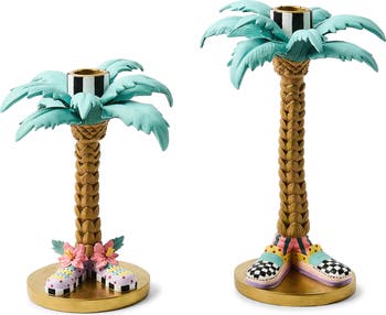 Add tropical flair to your home decor with these two charming palm tree candleholders that are anchored by vibrantly colored shoes, making them the perfect conversation starter.