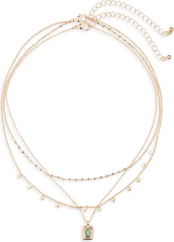 This set of two complementary necklaces includes one layered necklace composed of two delicate chains and one pendant necklace suspending a sparkling green jewel in a golden setting. Wear them together or separately for versatility in your wardrobe options.
