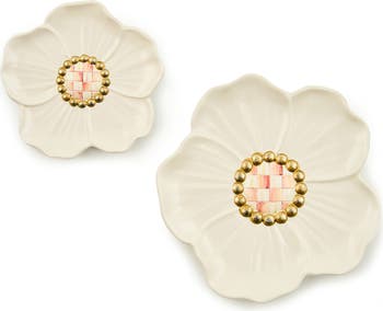 The label's signature hand-painted, color-dragged checks and golden accents center each of these flower-shaped resin trinket dishes, instantly bringing fresh verve to any living space.