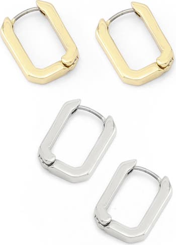 Show off industrial-chic shine with this set of sculptural huggie hoop earrings crafted in hexagonal silhouettes.