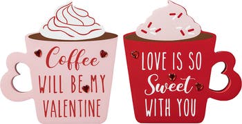 This Set of Valentine's Day Table Decoration is made of sturdy MDF material, featuring a romantic snow-capped coffee design paired with heart-shaped handles on the cups. You can put them on the desk or shelf, also as a gift to your loved ones, family or friends.