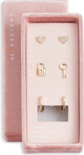 Pavé heart studs, lock-and-key earrings and sleek huggie hoops bring mix-and-match versatility in this luminous trio plated in 14-karat gold.