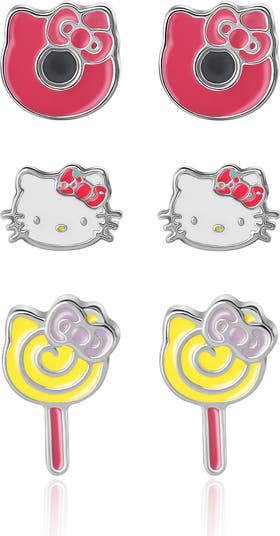Hello Kitty Set of 3 Earrings with Stud & Clip-On Styles, Main, color, Pink, Blue, Yellow