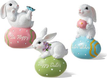 Celebrate Easter with this set of 3 resin bunnies! The lively bunnies feature different unique pose standing on the eggs, adding variety and charm to your Easter. Adorned with "Happy Easter", “Easter Wishes” and “Be Happy” message, creating a great addition to Easter celebration.