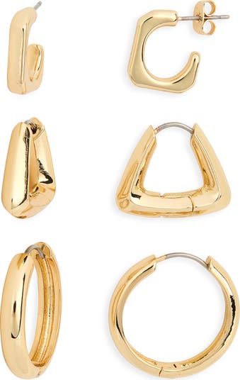 Switch up your hoop rotation thrice with this set of gleaming hoop earrings in various geometric silhouettes for fluid shine.