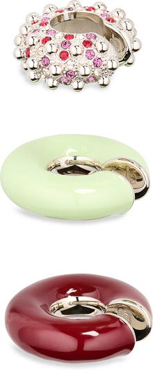 This set of three punk-style ear cuffs from Paco Rabanne comprises two glossy enamel cuffs in mint green and maroon coordinated with a gleaming beaded silvertone one studded with sparkling crystals.