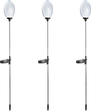 Enhance your outdoor living space with this elegant set of 3 solar-powered pathway lights. Crafted of high-quality plastic and stainless steel, it features crystal budding flower lamp and white glow LED that cast intriguing lights and shadows. Whether displayed alone or in multiples, it can create an eye-catching landscape that is sure to transform your garden, patio, or yard into a charming, delightful, and relaxing atmosphere!