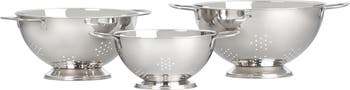 Easily rinse fruits and vegetables, drain pasta, strain yogurt and more in these stainless steel colanders designed to nest inside one another for easy storage. A pedestal base provides excellent stability, while the flat wire handles ensure a firm grip with wet hands.