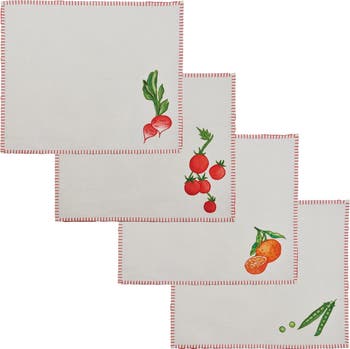 Farm-to-table takes on new meaning with this set of linen placements embroidered with fruit and vegetable motifs and edged with blanket stitching.