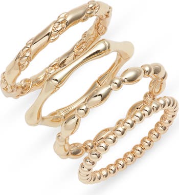 A mix of textures distinguish a stylish set of four rings that can be worn together or apart.