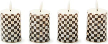 Add to ambience to every setting with this set of four flameless votive candles decorated with the brand's signature courtly check pattern. These candles have a wax exterior with a plastic center and cast a flameless glow created with four CR2450 batteries.