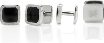 Sleek stainless steel and polished onyx elevate a charming set of formal shirt studs.