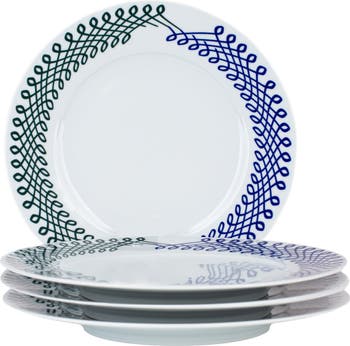 Made by masterful artisans in Portugal, this delicate set of porcelain dinner plates features an ornately rendered two-tone border that brings artisanal beauty to your tabletop spreads.