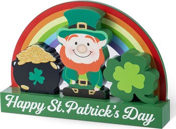 This 12"L Set of 4 St. Patrick's Wooden Table Block includes a rainbow topped base with "Happy St. Patrick's Day" wording, plus a pot of gold, a leprechaun, and a shamrock block. You can arrange them to create a festive, Irish themed display for your table.