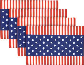 Whether you're hosting a Fourth of July barbecue or simply gathering for a family meal, these placemats create an inviting atmosphere that honors the traditions and values that make America exceptional. Adorned with the iconic stars and stripes pattern, these placemats not only protect your table but also tell a story of a vibrant nation. Features: Set of 4 Americana placemats USA flag-inspired stars and stripes design Reinforced and hemmed edges for fray prevention Double layered with solid white backing For indoor use only Dimensions: 12” high x 18" wide Material(s): polyester Note: Set includes 4 of the placemat shown