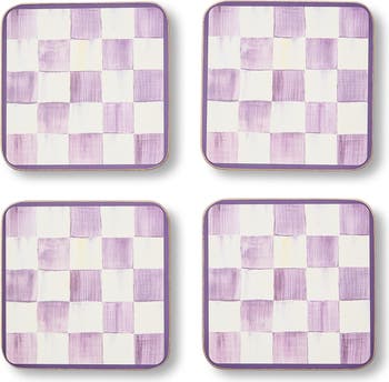 The brand's signature hand-painted checks decorate the heat-resistant lacquered surface of these coasters that protect surfaces with a natural-cork back.