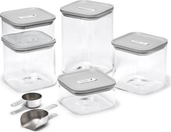 - Set includes five containers with lids, stainless steel scoop, measuring cup and storage organizer