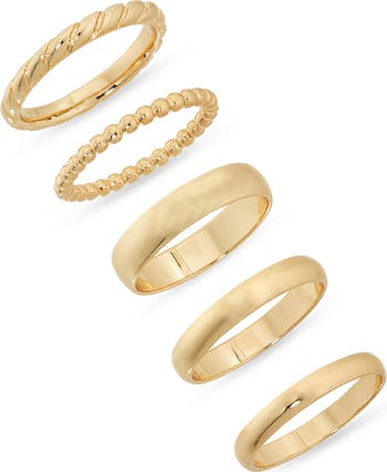 A mix of textures distinguish a stylish set of five rings that can be worn together or apart.