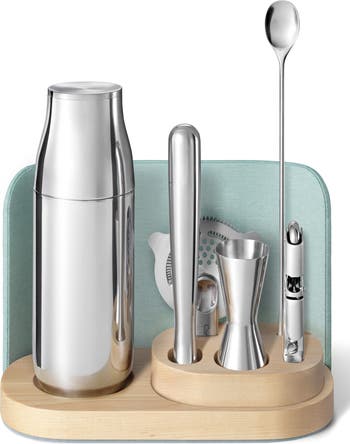 - Set includes shaker, muddler, wine key, strainer, spoon, jigger and storage caddy