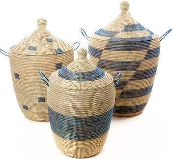 This Set of Three Blue and Cream Mixed Pattern Hampers offers a coordinated collection of handcrafted baskets in soothing coastal hues and artful patterns. Each piece is woven in Senegal using traditional coiling techniques that combine cattail reeds with salvaged plastic cord, resulting in sturdy forms with soft texture and subtle visual interest. The mix of stripes, zigzags, and geometric motifs in calming blues and creamy neutrals creates a relaxed yet refined aesthetic that complements a range of interiors, from airy coastal to modern minimalist. Perfect for bringing order and style to your home, this trio of hampers makes it easy to sort laundry, store linens, or contain toys and everyday essentials while keeping spaces looking intentional. The graduated sizes nest neatly for compact storage when not in use, yet stand beautifully on their own when needed, bringing thoughtful organization to bedrooms, bathrooms, playrooms, or laundry areas. With their inviting color palette and artisanal charm, these baskets elevate everyday tasks into moments of effortless style