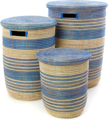 This Set of Three Blue Ebb & Flow Striped Hampers brings a calming rhythm of coastal-inspired stripes and serene blue tones into your home. Handcrafted in Senegal using traditional coiling techniques, each hamper is woven from natural cattail reeds wrapped in dyed and undyed salvaged plastic cord, creating a sturdy yet lightweight weave with appealing texture and structure. The trio’s graduated sizes and soothing palette make them feel like a thoughtfully curated set instead of just functional storage. Subtle variations in pattern reflect the hands that made them, giving each piece its own quiet character. Perfect for organizing laundry, linens, toys, or everyday essentials, this set helps bring order to bedrooms, bathrooms, or laundry spaces while infusing them with effortless style. The largest basket handles bigger loads with ease, while the medium and small offer versatile storage wherever it’s needed most. Whether tucked into closets or displayed out in the open, these artisan-crafted hampers create calm, cohesive organization and bring a gentle sense of design to daily life