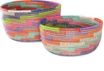 This set of Rainbow Knitting Baskets includes two handcrafted storage baskets woven in vibrant, multicolored stripes that brighten any space while keeping it organized. Each basket is expertly woven by Wolof women artisans in rural Senegal using traditional coiling techniques. Natural cattail stalks are wrapped with colorful, salvaged plastic strips to create a sturdy yet lightweight weave. Because these baskets are crafted by hand, slight variations in pattern and size give each set a unique, artisanal character that adds charm to everyday living. Perfect for organizing knitting supplies, yarn, craft tools, or other household treasures, these baskets also work beautifully as general storage in living rooms, playrooms, or home offices. The baskets nest together when not in use for space-saving convenience, and their bright rainbow hues make them delightful decorative accents. Whether used for practical storage or to display cherished items, these artisan-made baskets bring both function and vibrant cultural style into the home
