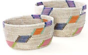 This colorful set includes two handwoven storage baskets that combine a crisp white base with playful blocks of color for a cheerful, contemporary look. Each basket is meticulously crafted by Wolof women artisans in rural Senegal using traditional coiling techniques, where natural cattail stalks are wrapped with vibrant salvaged plastic strips to form a durable and lightweight weave. Because these baskets are made by hand, slight variations in pattern and size make every set uniquely beautiful, blending artisanal charm with everyday practicality. Perfect for organizing knitting supplies, yarn, craft tools, or other household items, these baskets also add stylish storage to living rooms, playrooms, or home offices. Their nesting design lets the smaller basket fit inside the larger for easy storage when not in use, and the colorful block pattern brings a bright, inviting accent to any room. Whether used for functional organization or as decorative accent pieces, these artisan-crafted baskets bring both practical utility and joyful style into the home