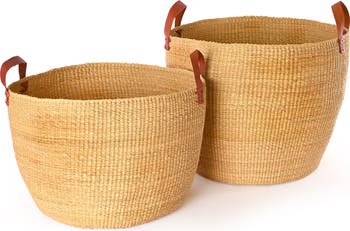 Weavers in the Bolgatanga region of Ghana are known around the world for their beautiful basket weaving. These large natural baskets are woven from tough elephant grass. Designed to nest together for shipping, each basket features two brown leather handles. Sold as a pair. Because this is a handcrafted item, each may vary slightly. Small: 15"L x 15"W x 13"H Large: 17"L x 17"W x 15"H